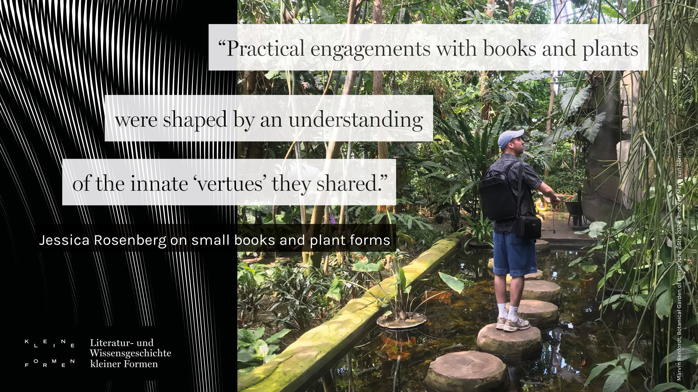 As a closing of the visit of literary scholar Jessica Rosenberg to our research group, in the summer of 2024 the microform team interviewed her at the Botanical Garden of Berlin about her first book Botanical Poetics: Early Modern Plant Books and the Husbandry of Print (2023), as well as on her current project “Shakespeare’s Second Nature. Tricks, Knacks and the remaking of Renaissance Worlds”.